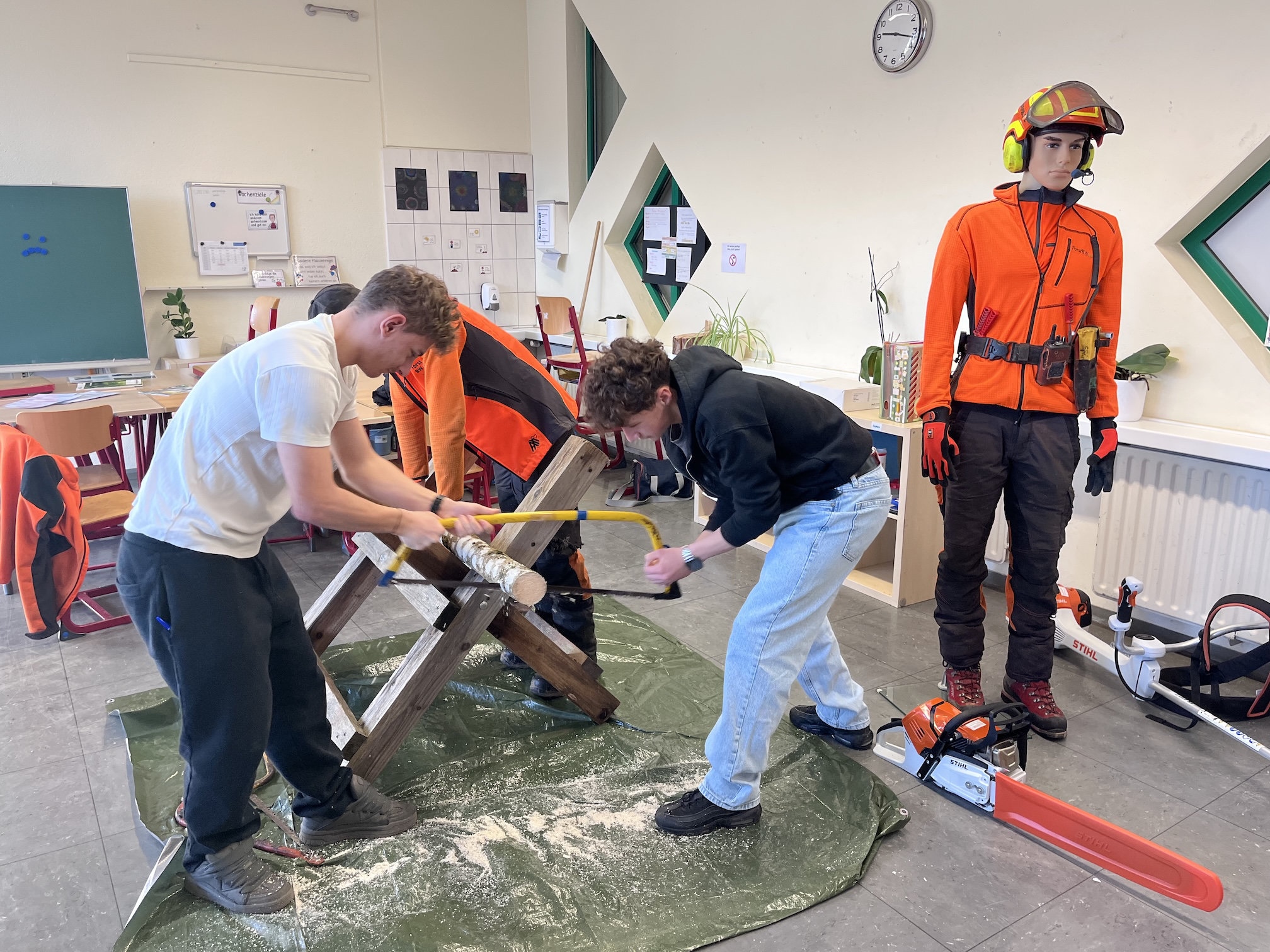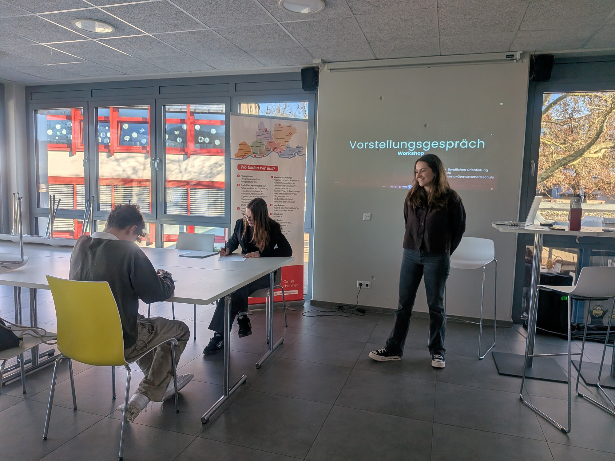 Auf diese Weise konnten sie mit Vertreterinnen und Vertretern regionaler Unternehmen ins Gespräch kommen. So stellte die Caritas Hochrhein soziale und pflegerische Berufe vor. Die Schülerinnen und Schüler bekamen Einblicke in die Arbeit mit älteren oder unterstützungsbedürftigen Menschen und erfuhren mehr über Ausbildungsmöglichkeiten wie die Pflegefachkraft oder den Beruf der Heilerziehungspflegerin bzw. des Heilerziehungspflegers. Bei ForstBW drehte sich alles um den Wald als Arbeitsplatz. Anhand anschaulicher Beispiele wurde gezeigt, wie nachhaltig moderne Forstwirtschaft funktioniert und welche Aufgaben Forstwirtinnen und Forstwirte übernehmen – von der Pflege junger Bäume bis zur Holzernte.
