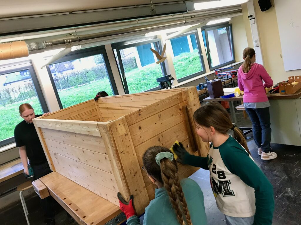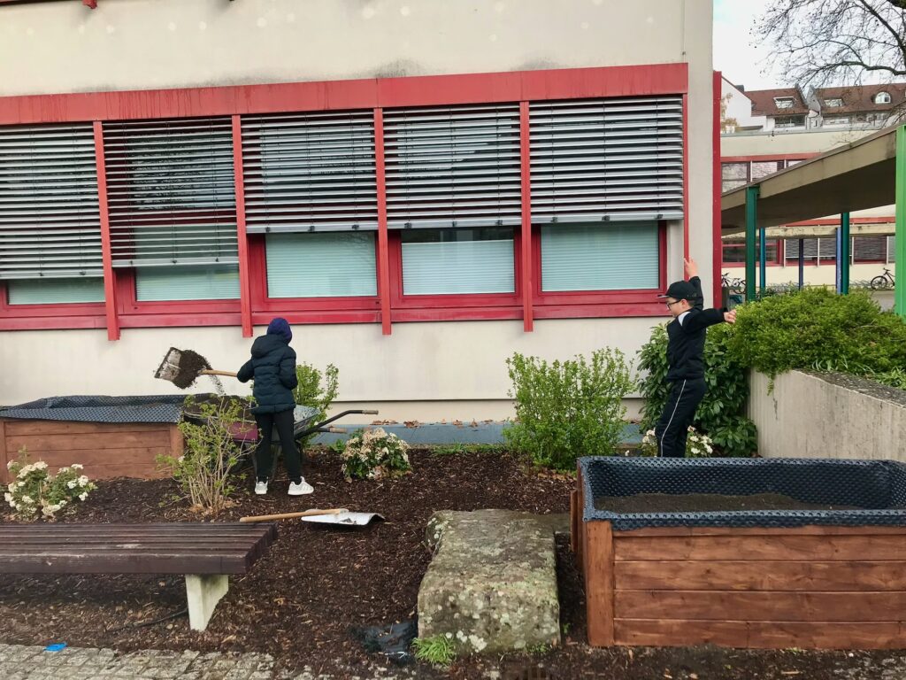Am Dienstag ging es weiter mit dem Lasieren der Hochbeete und anschließend an das Aufstellen auf dem Schulhof. Nachdem von der Stadtgärtnerei Bad Säckingen Material in Form von Hackschnitzeln und Erde geliefert wurde, stand das Befüllen der Hochbeete auf dem Programm. Hierbei war voller Muskeleinsatz gefragt.