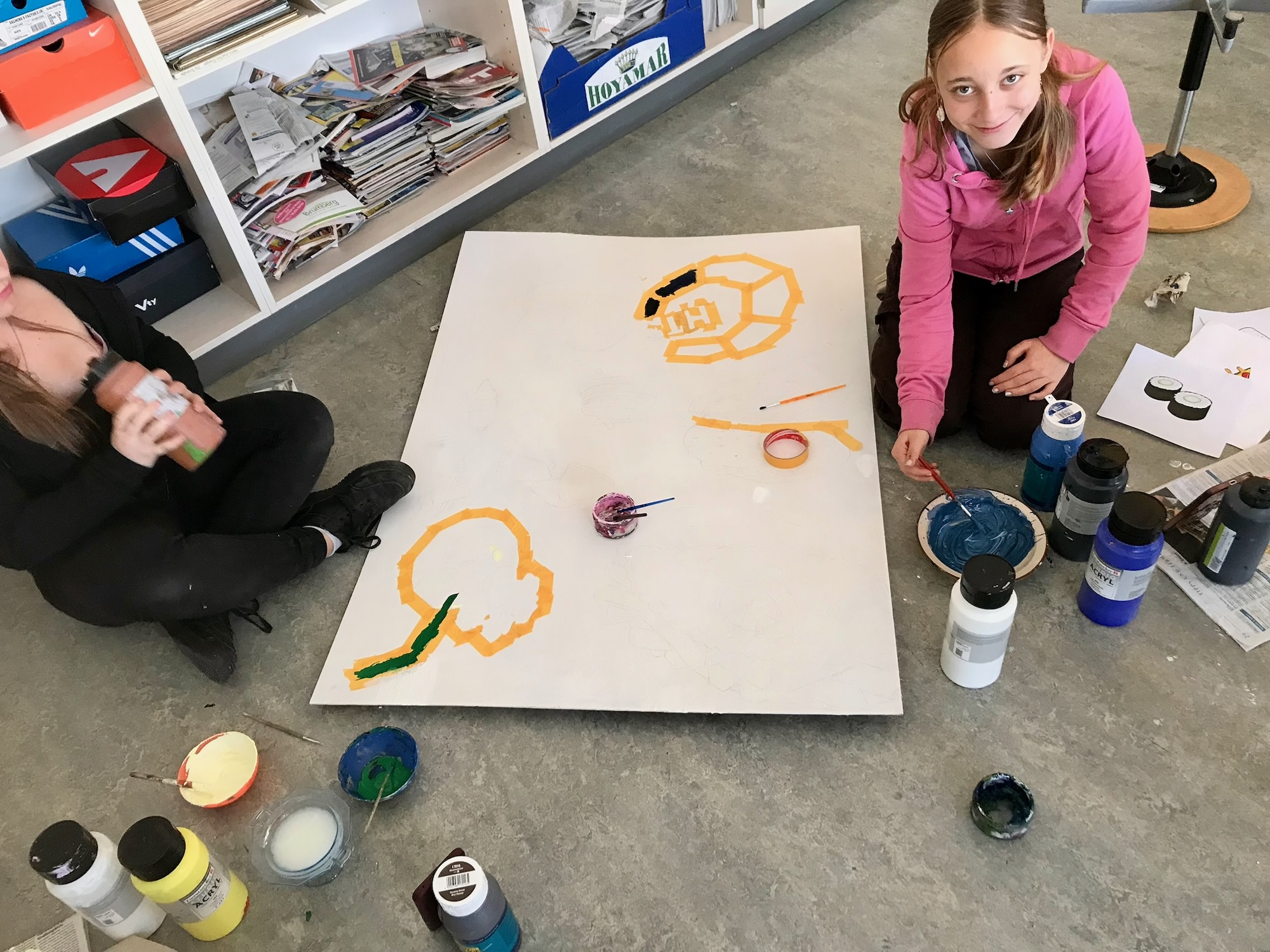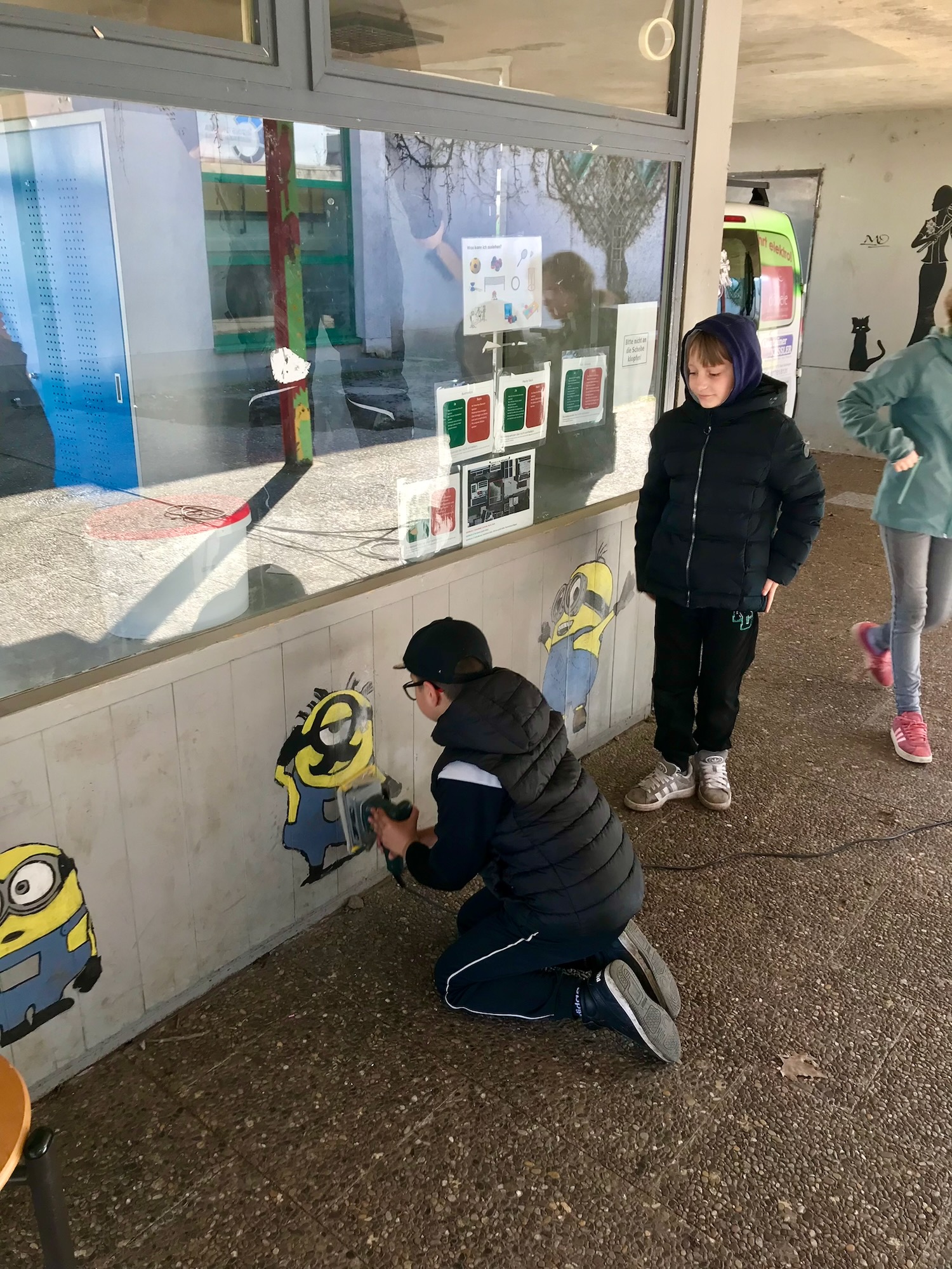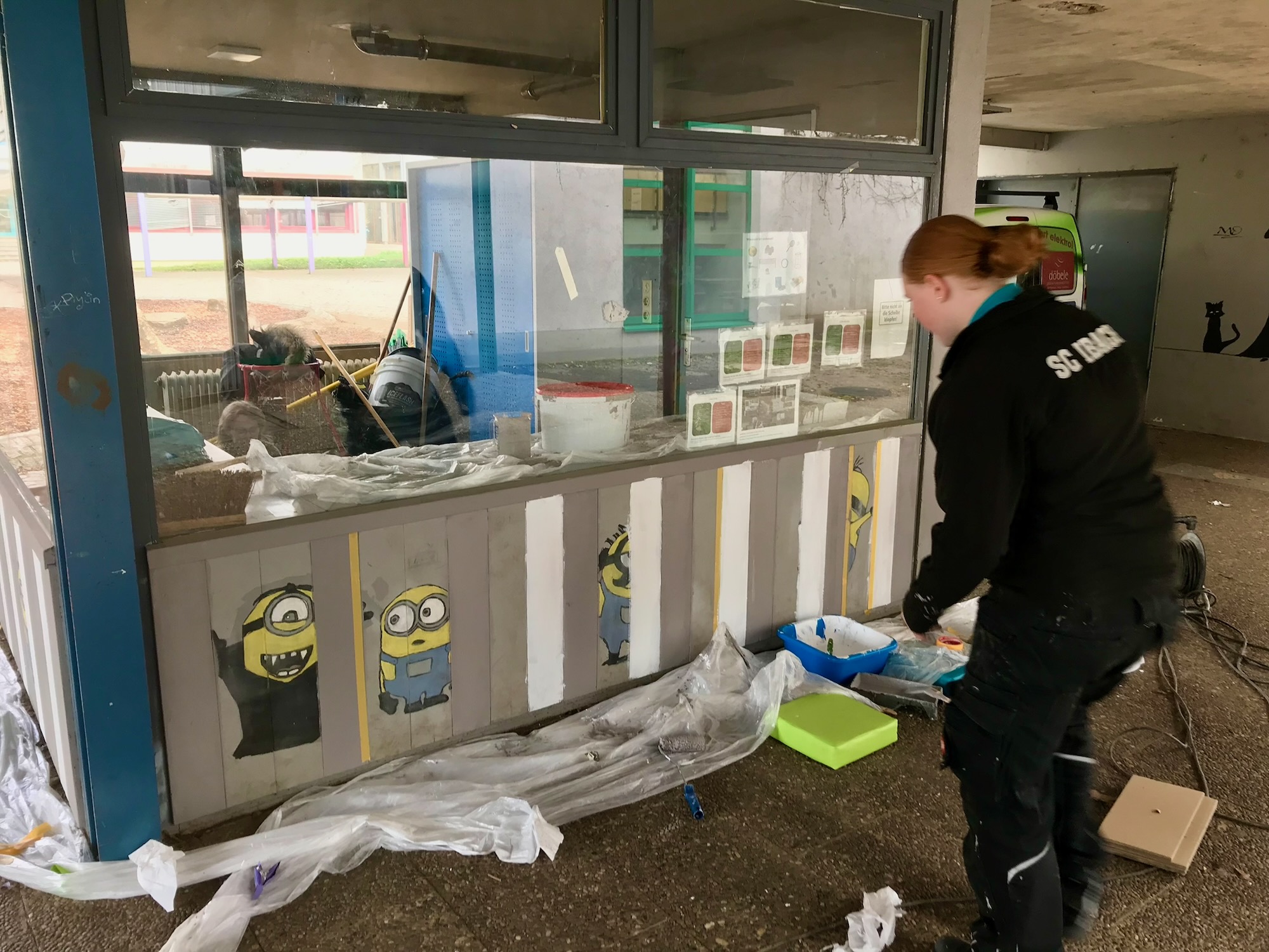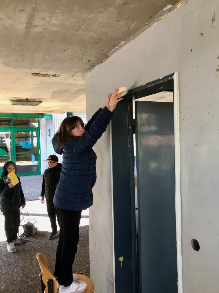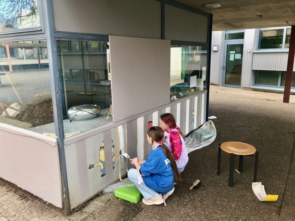 Am Mittwoch wurden die Schülerinnen und Schüler in mehrere Teams eingeteilt, sodass unterschiedliche Projekte zeitgleich stattfinden konnten. Eine Gruppe hat sich um die Neugestaltung des Spielekiosks gekümmert. Dieses wurde von innen geschliffen, abgeklebt und in einem neuen Farbton gestrichen. Ein anderes Team hatte den Auftrag, sich um selbstgemalte Bilder für die Verschönerung der Mensa zu kümmern. Hierzu wurden schöne Motive auf Leinwände projiziert und diese dann farbig von Hand bemalt.