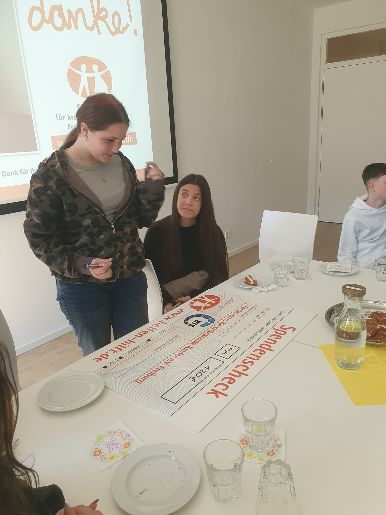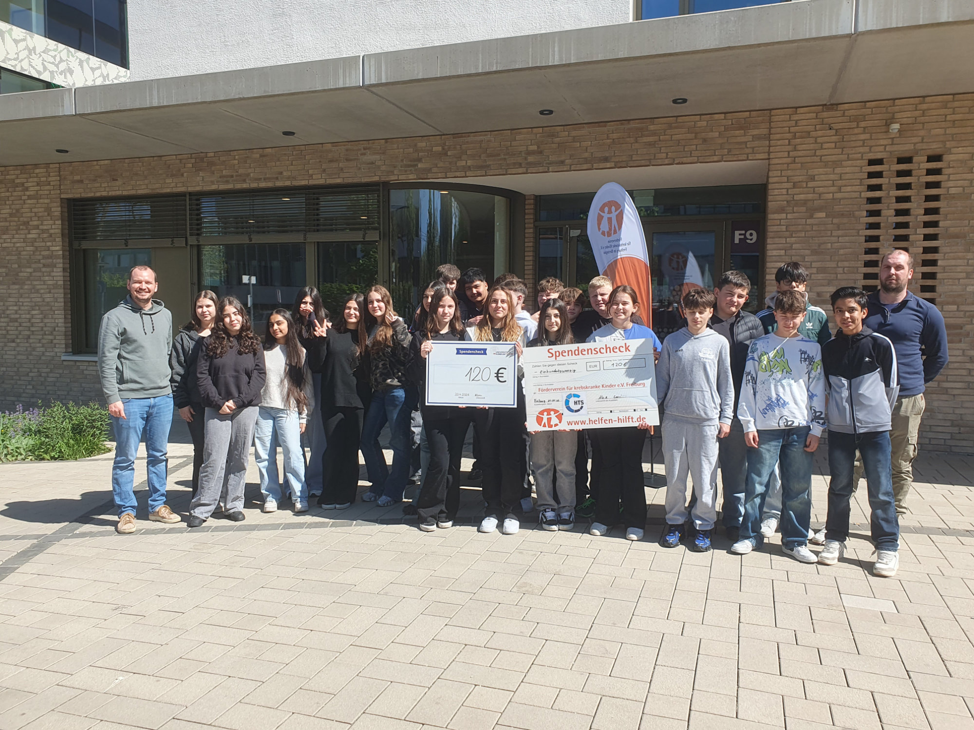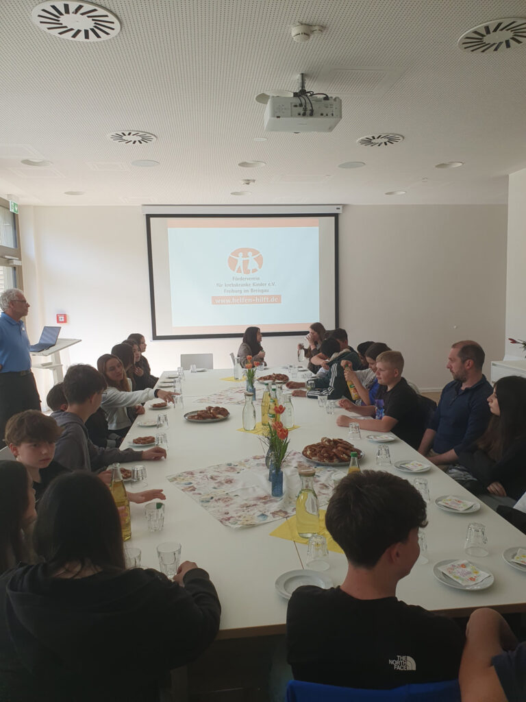 Am Montag, den 20. April, fuhr die Klasse 7c nach Freiburg, um jeweils 120€ an den Verein für krebskranke Kinder und die Uniklinik Freiburg zu übergeben. Die Summe stammt aus vier Kuchenverkäufen: 60% der Einnahmen wurden gespendet, 40% verwendet die Klasse für die bevorstehende Klassenfahrt nach Sigmaringen.